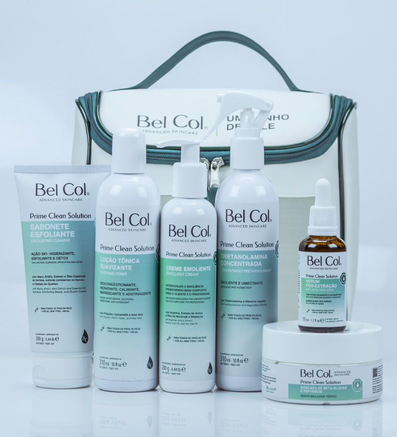 A Bel Col apresenta o Prime Clean Solution, uma limpeza de pele inovadora com ação bioestimuladora, composta por seis produtos de alto rendimento, excelente desempenho e praticidade. Um kit que oferece muito mais conforto ao remover resíduos, secreções e comedões da pele. A ação bioestimuladora do kit Prime Clean Solution promove regeneração celular e melhora a vitalidade da pele, pois contem ingredientes que estimulam os processos naturais de reparação e renovação resultando em uma pele mais saudável, mais radiante e muito mais resistente aos danos do dia a dia. O kit Prime Clean Solution proporciona ação higienizante, detox, antisséptica, dermopurificante e regenerativa, garantindo resultados surpreendentes. Com excelente desempenho e praticidade, oferece ao profissional muito mais praticidade e muito mais conforto para remover resíduos, secreções e comedões da pele. O kit possui excelente custo-benefício e permite realizar aproximadamente 100 limpezas de pele Uma questão de escolha inteligente e econômica para o para os profissionais da área.