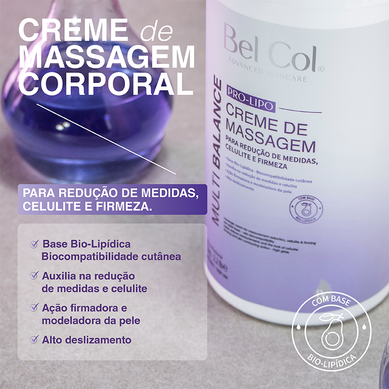 O Pro-Lipo Multi-Balance Bel Col é um creme de massagem corporal desenvolvido com tecnologia exclusiva de Base Bio-Lipídica, que associa óleo de abacate e manteiga de karité, ricos em vitaminas A, D e E e ácidos graxos essenciais, para mimetizar a estrutura lipídica natural da pele, promovendo nutrição, elasticidade e conforto cutâneo durante as manobras. Sua fórmula combina ativos redutores, firmadores e anticelulíticos em sinergia equilibrada como Nano Cafeína, L-Carnitina, Peptídeo TR41, Coenzima Q10, Colágeno, Elastina, Extratos Botânicos de Centella Asiática, Ginkgo biloba e Gengibre, além de Algas Marinhas (Fucus vesiculosus) e Óleo Essencial de Lavanda.