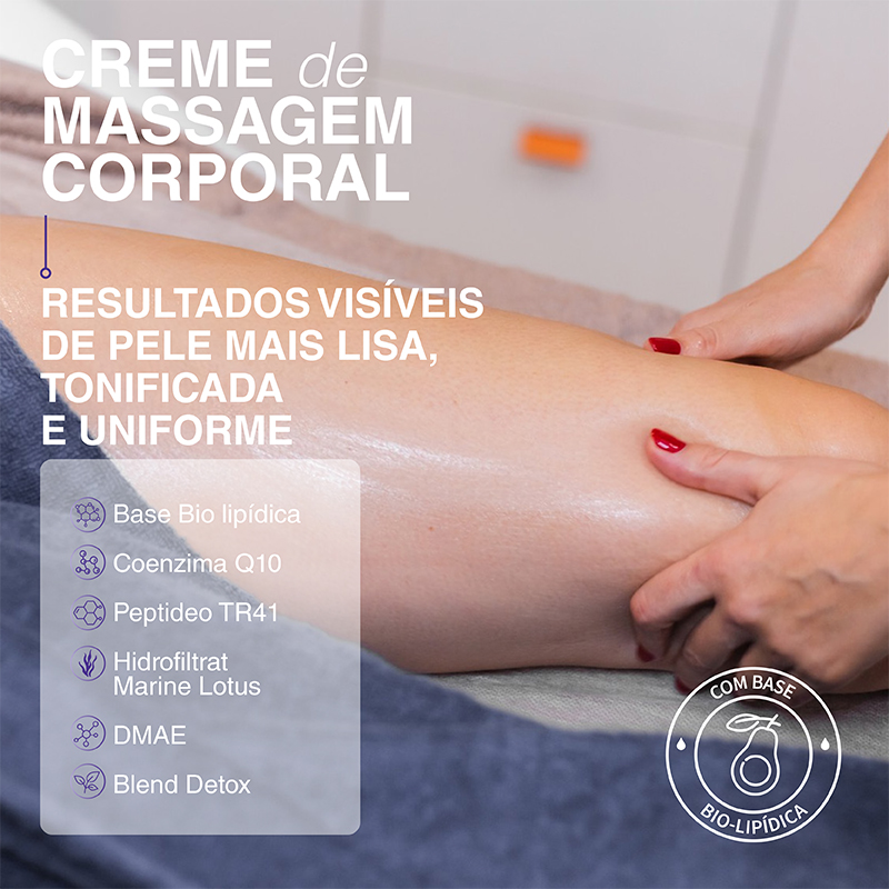 Creme de massagem corporal com tecnologia bio-lipídica e ativos redutores, firmadores e anticelulíticos. Proporciona nutrição e elasticidade à pele, auxiliando na redefinição dos contornos corporais.