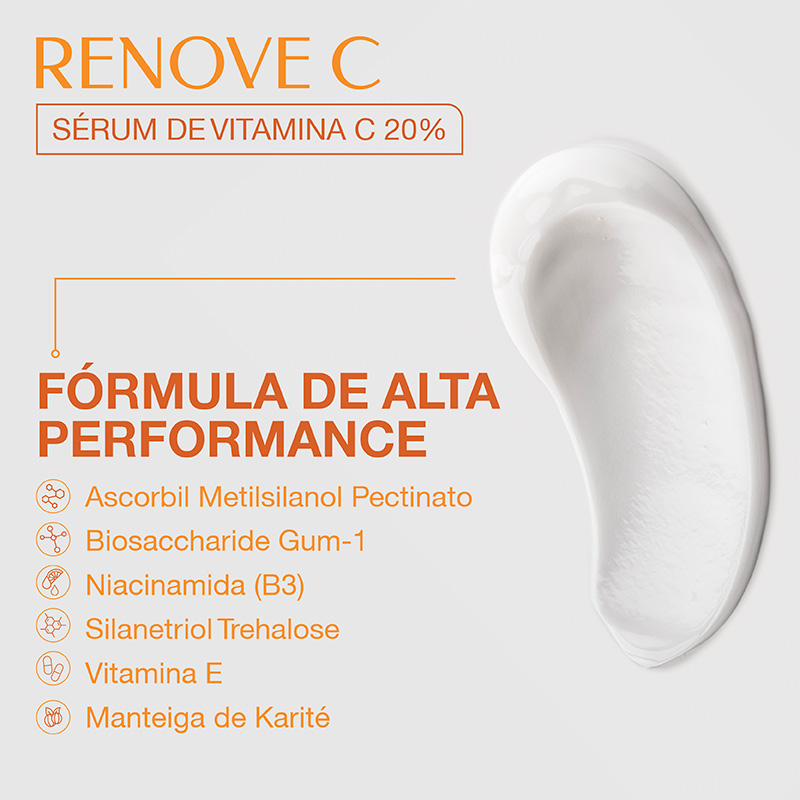 O Creme de Vitamina C Renove C apresenta formulação baseada na estabilidade da molécula de ácido ascórbico modificada com Silício Bioativo e Pectina. Esta combinação exclusiva oferece uma ação antioxidante poderosa, combatendo os radicais livres e promovendo a biossíntese do colágeno, clareamento, revitalização e rejuvenescimento da pele.